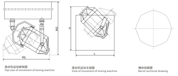 In the mixed operation, the mixing barrel simultaneous rotation and revolution, the polyhedral mixing drum produces strong roll rotary rolling action, and by the mixing barrel itself polyhedral function affect, increase material angle, increase the rolling range, eliminate the centrifugal force malady, thoroughly to ensure that the material self flow and diffusion effect, and make the material to avoid the proportion of deflection, stratification, accumulation and dead ends, so as to make it reach the 100% mixing requirements.