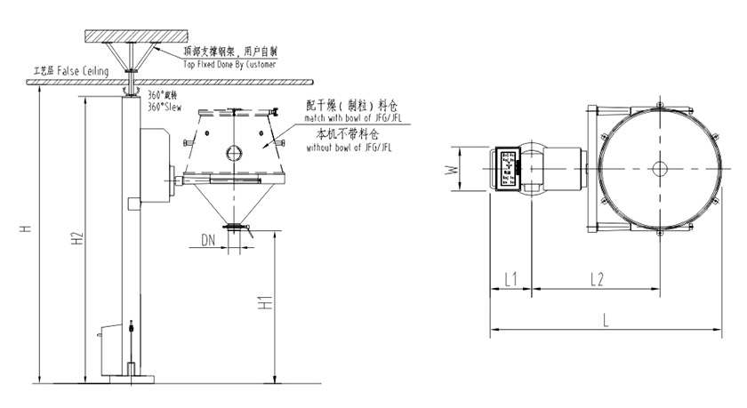 該機主要由底盤、立柱、提升系統(tǒng)、翻轉(zhuǎn)系統(tǒng)等 組成。工作時將錐形料斗與沸騰制粒機或沸騰干 燥機的料倉扣合。啟動提升按鈕,料倉提升;啟 動翻轉(zhuǎn)按鈕,料倉即可翻轉(zhuǎn)180°。松開剎車, 水平旋轉(zhuǎn)立柱到工藝要求位置,再下降料倉到工 作高度,打開蝶閥,使物料轉(zhuǎn)移到下一工序。